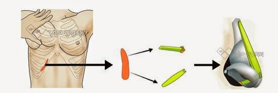 - กระดูกอ่อนในโพรงจมูก (Septal cartilage) ถือเป็นชิ้นส่วนกระดูกอ่อนที่ดีที่สุด ที่เอามาเสริมปลายจมูก ป้องกันปัญหาจมูกทะลุได้ในอนาคตและยังตกแต่งปลายจมูกให้เป็นปลายหยดน้ำได้ตามต้องการ